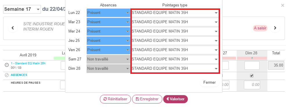 Vous pouvez modifier le pointage type directement sur le relevé d'heure pour une ou plusieurs journée(s) lors de la saisie des heures.