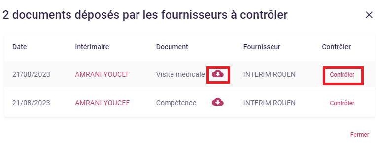 Vous pouvez cliquer sur le nom de l'intérimaire et contrôler les document via la fiche de Personnels ou télécharger le document par l'intermédiaire de la fenêtre et ensuite le noter comme contrôlé si tel est le cas :