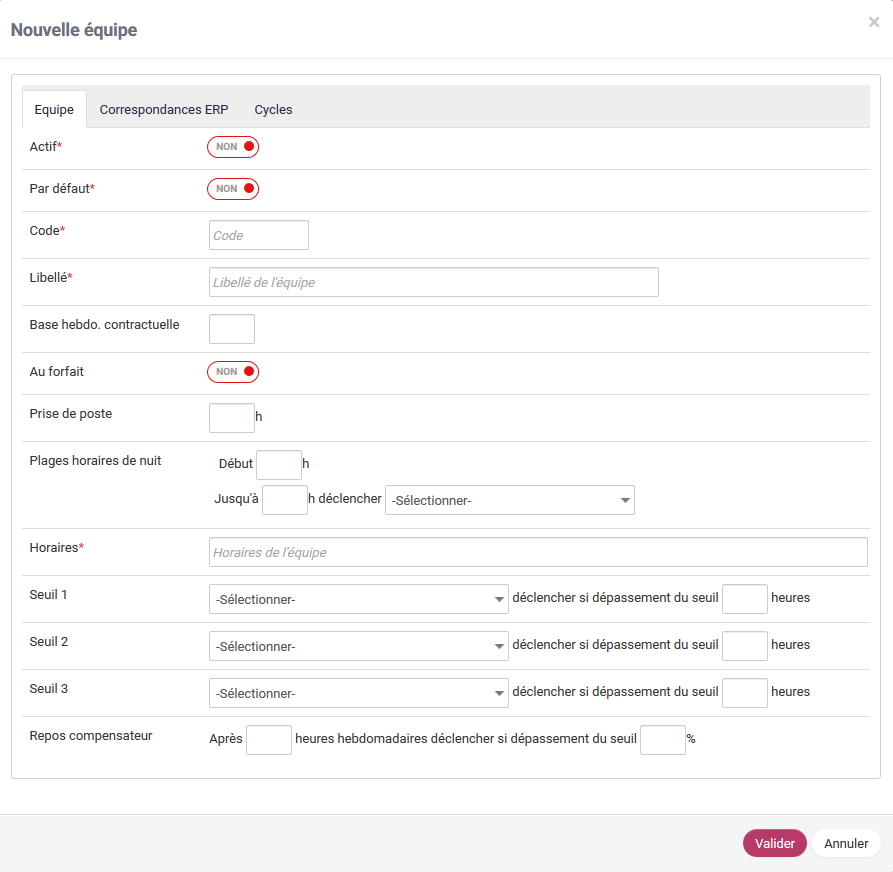 L'équipe type permet le paramétrage de l’enchaînement des horaires types, des heures de nuits et des heures supplémentaires.