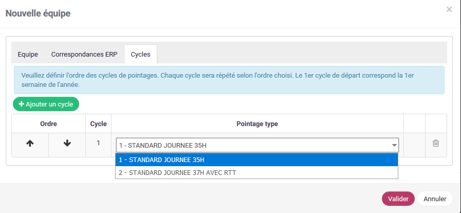 Ce paramétrage permet de déterminer les pointages types rattachés à l'équipe et notamment les enchaînements d'horaires (cas de cycles)