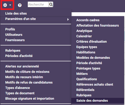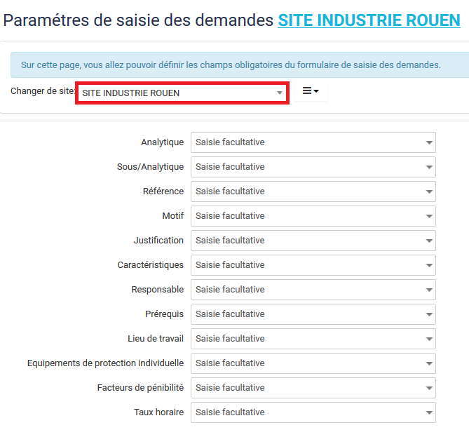 Nous vous invitons à sélectionner un site et à choisir de rendre la saisie obligatoire ou facultative pour chacun des éléments :
