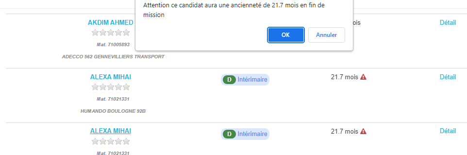 Par ailleurs, vous disposez d’alertes paramétrables sur l’ancienneté de vos intérimaires. En effet, quand un candidat est ajouté sur une demande, l’application calcule son ancienneté jusqu’à la fin de la mission. Si ce calcul dépasse ce qui a été paramétré, une fenêtre vous en informe et vous demande si vous souhaitez continuer avec ce candidat ou non.