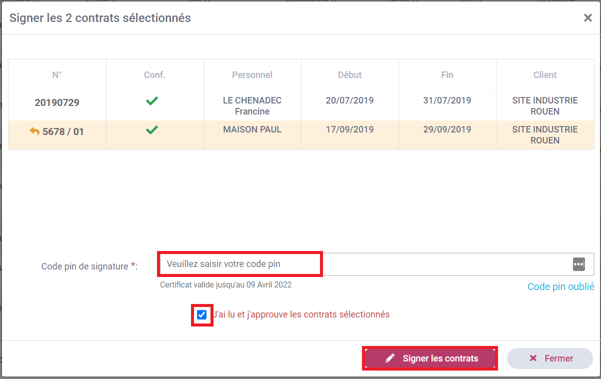 Cochez les contrats à signer et cliquez sur Signer les contrats