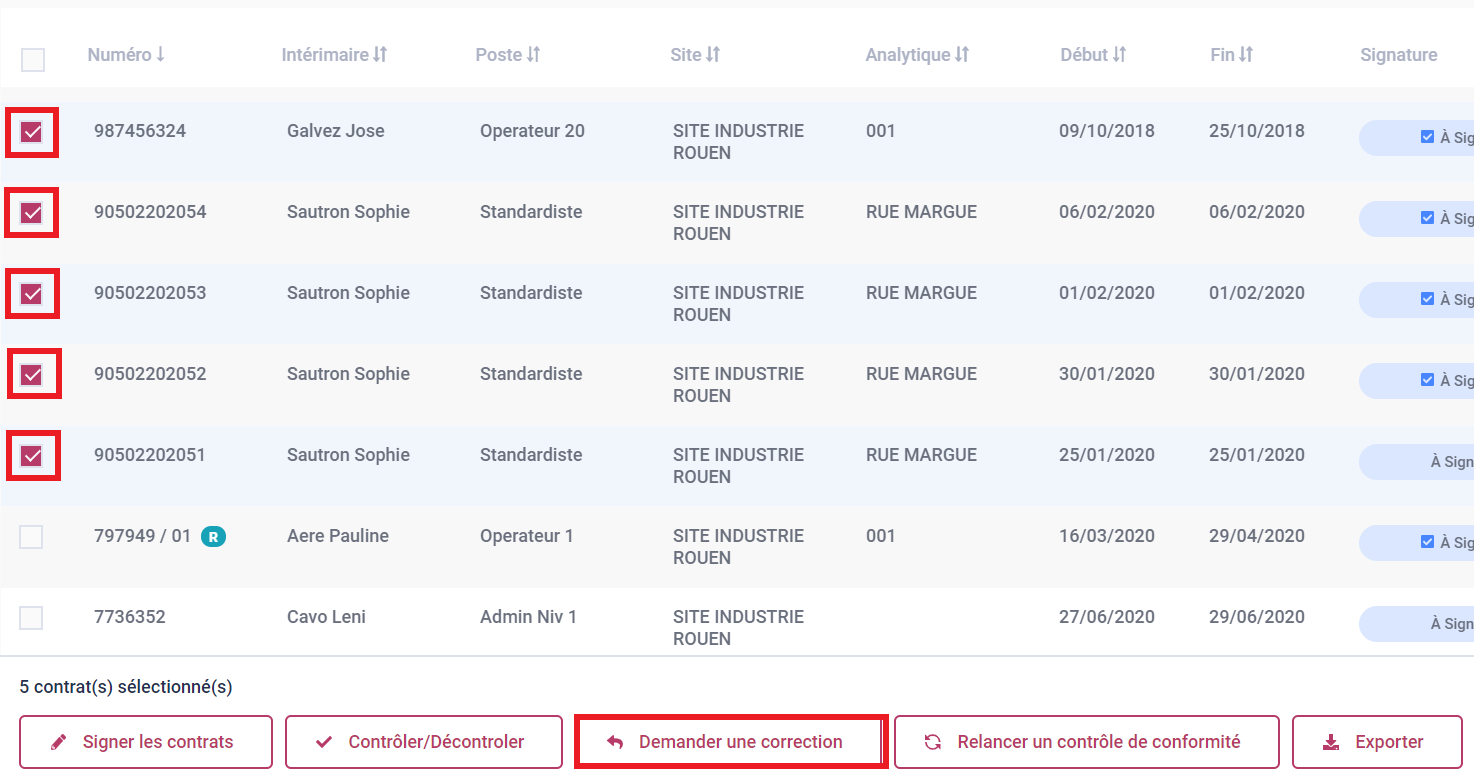 Cochez les contrats en question et cliquez sur Demander une correction en bas de page.