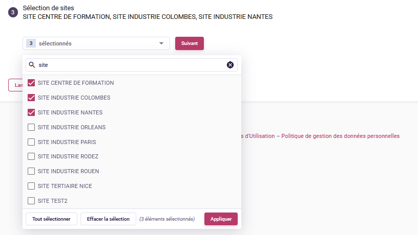 Vous devez maintenant sélectionner les sites concernés (un ou plusieurs en fonction de votre besoin), "Appliquer" et "Suivant" :