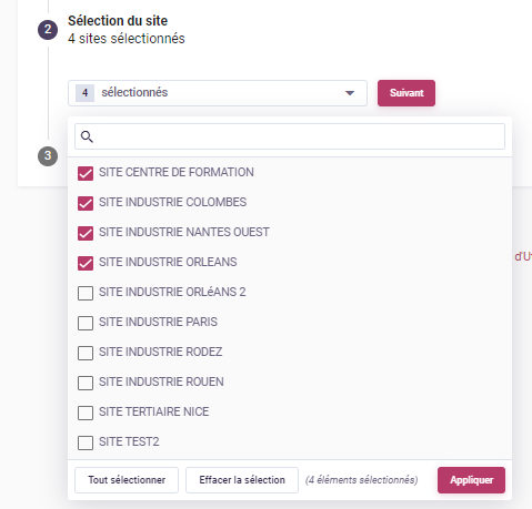 Vous devez ensuite sélectionner les sites concernés (un ou plusieurs en fonction de votre besoin), "Appliquer" et "Suivant".