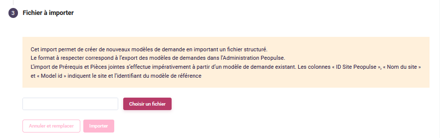 L'info en + : si vous souhaitez modifier un modèle de demande déjà existant, vous devez passer par l'action Annuler et remplacer en reprenant bien dans votre fichier l'ensemble des lignes existantes que vous souhaitez conserver (la différence étant supprimée). Vous pouvez également effectuer l'action manuellement depuis Paramètres d'un site > Modèles de demandes si le spectre est limité.